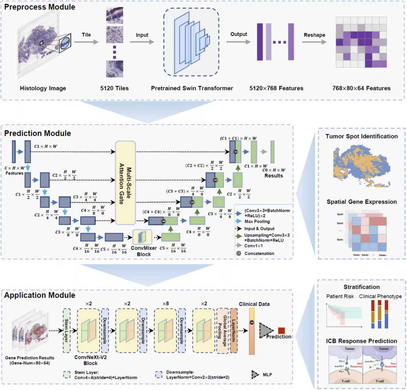 HiST is a multi-scale convolutional deep learning framework for analyzing spatially resolved gene expression profiles (GEPs) and histological morphology. The tool accurately predicts tumor regions (e.g., breast cancer AUC: 0.96) and reconstructs spatial GEPs with high correlation (average PCC: 0.74). HiST also enables prognostic prediction (e.g., breast cancer C-index: 0.78) and immunotherapy outcome assessment, while revealing key regulatory networks.