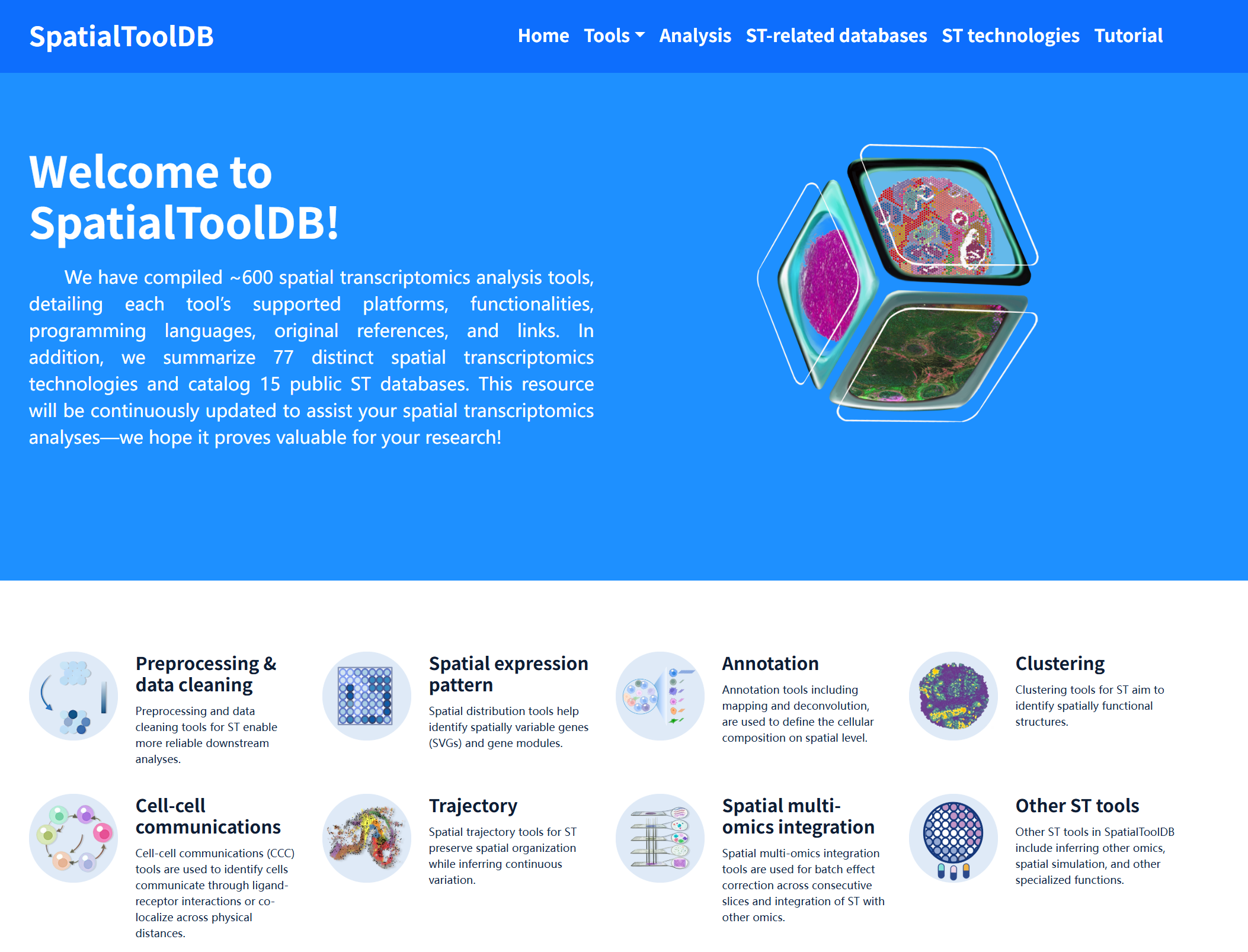 SpatialToolDB is a comprehensive resource designed to systematically catalog analytical methods and resources in the field of spatial transcriptomics. Here, we compiled approximately 600 spatial transcriptomics analysis tools, with detailed annotations including supported platforms, core functionalities, programming languages, original publications, and relevant links. In addition, we curated 77 distinct spatial transcriptomics technologies and summarized 15 publicly available spatial transcriptomics databases. SpatialToolDB is continuously updated to support method selection, benchmarking, and workflow design, providing a valuable reference for spatial transcriptomics research.